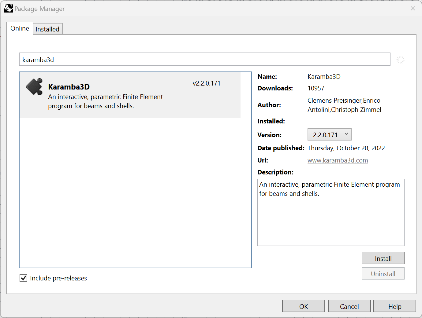 YAK is the Package Manager for Rhino. It can automatically download and install plug-ins required for a specific Grasshopper definition. Thus one possibility of installing Karamba3D is to open a GH definition with some Karamba3D components in it. Alternatively the package manager can be started in Rhino by typing 'PackageManager' in the command window. Make sure to activate 'Include pre-releases' in the window that pops-up. Under YAK Karamba3D comes as 'karambaGH' which installs the FULL version of Karamba3D.